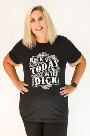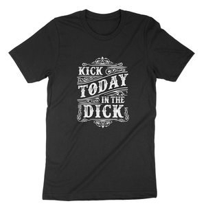 Kick Today in the Dick is a modern version of "Seize the Day"! Life might be hard but you get your shit together, and get what you need to get done, DONE by Kicking Today in the Dick! If you love t-shirts with funny sayings on them, this is the best t-shirt saying ever. It makes people of all ages laugh, and to be real with you, kinda makes other people pissed off.