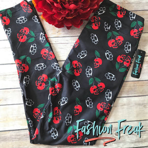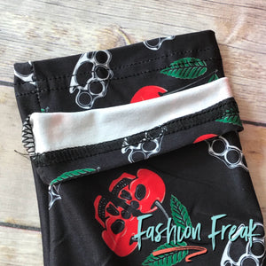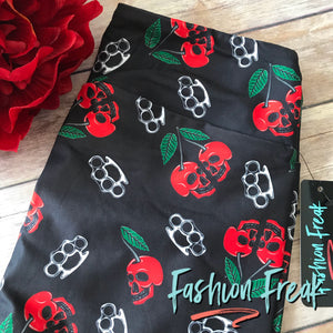 Our exclusive Cherry Knockout leggings are perfect for the badass woman that don’t mess around. The print is composed of cherries in the shape of skulls with sprinkled in brass knuckles. Kick all of the ass with these leggings on! Intimidation is the game & you’re going to win it! Show your hardcore side & wear these with pride.